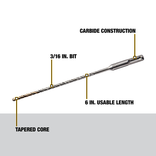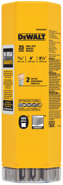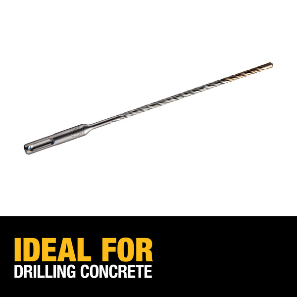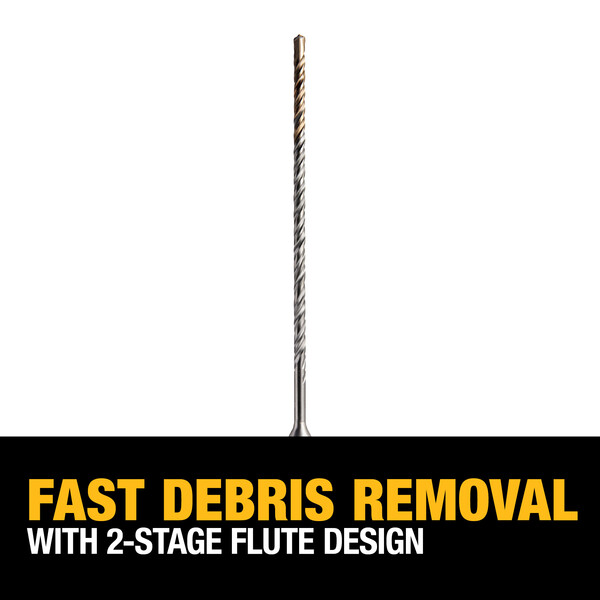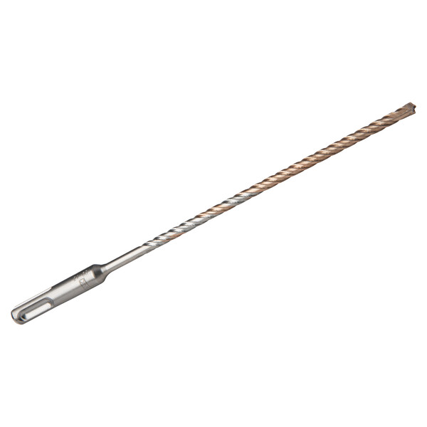 SDS Plus 2 Cutter Drill Bits have a strong tapered core to help resist flute breaks, especially when drilling deep holes. For optimal drilling speeds, the two-stage flute design features a variable helix pattern that quickly moves debris away from the contact zone.