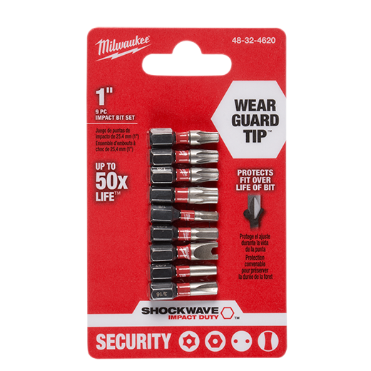 Our 9 Piece SHOCKWAVE™ 1″ Security Impact Bit Set is engineered to be the Most Durable, Best Fitting driver bits on the market. The Wear Guard Tip™ delivers increased wear resistance which protects the fit over the life of the bit. The Shockzone™ is optimized for for each tip type and length of driver bit to absorb peak torque and prevent breaking. The Custom Alloy76™ has a customized steel and heat treatment per tip type to extend the life of the driver bits, providing up to 50X life vs. competitive impact driver bits. SHOCKWAVE™ driver bits are built to deliver extreme durability for the most demanding applications.